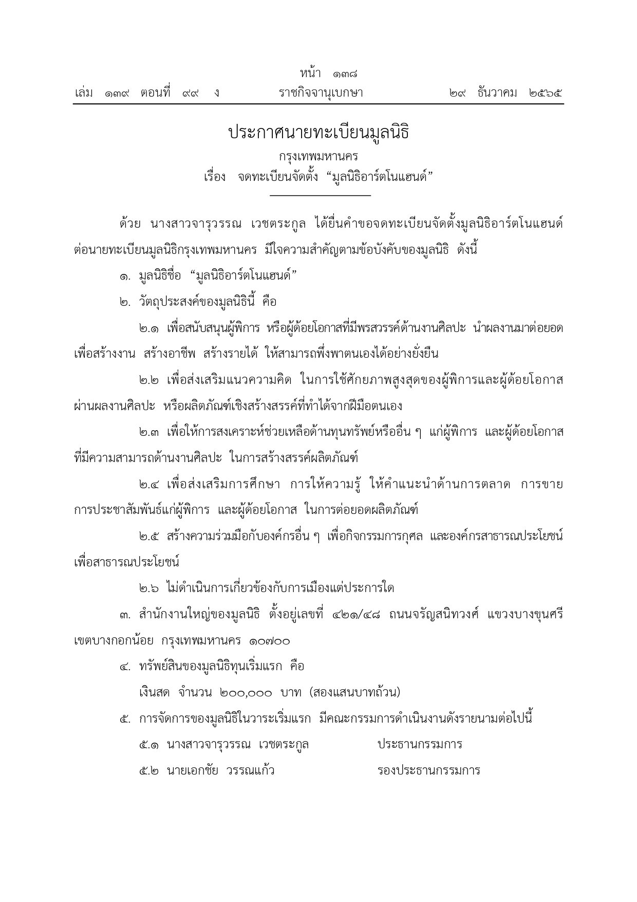 ราชกิจจานุเบกษาประกาศ เรื่องจดทะเบียนจัดตั้งมูลนิธิอาร์ตโนแฮนด์