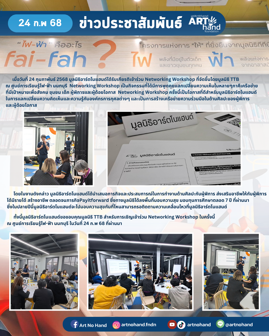 ทั้งนี้มูลนิธิอาร์ตโนแฮนด์ขอขอบคุณมูลนิธิ TTB สำหรับการเชิญเข้าร่วม Networking Workshop ในครั้งนี้ ณ ศูนย์การเรียนรู้ไฟ-ฟ้า นนทบุรี ในวันที่ 24 ก.พ 68 ที่ผ่านมา