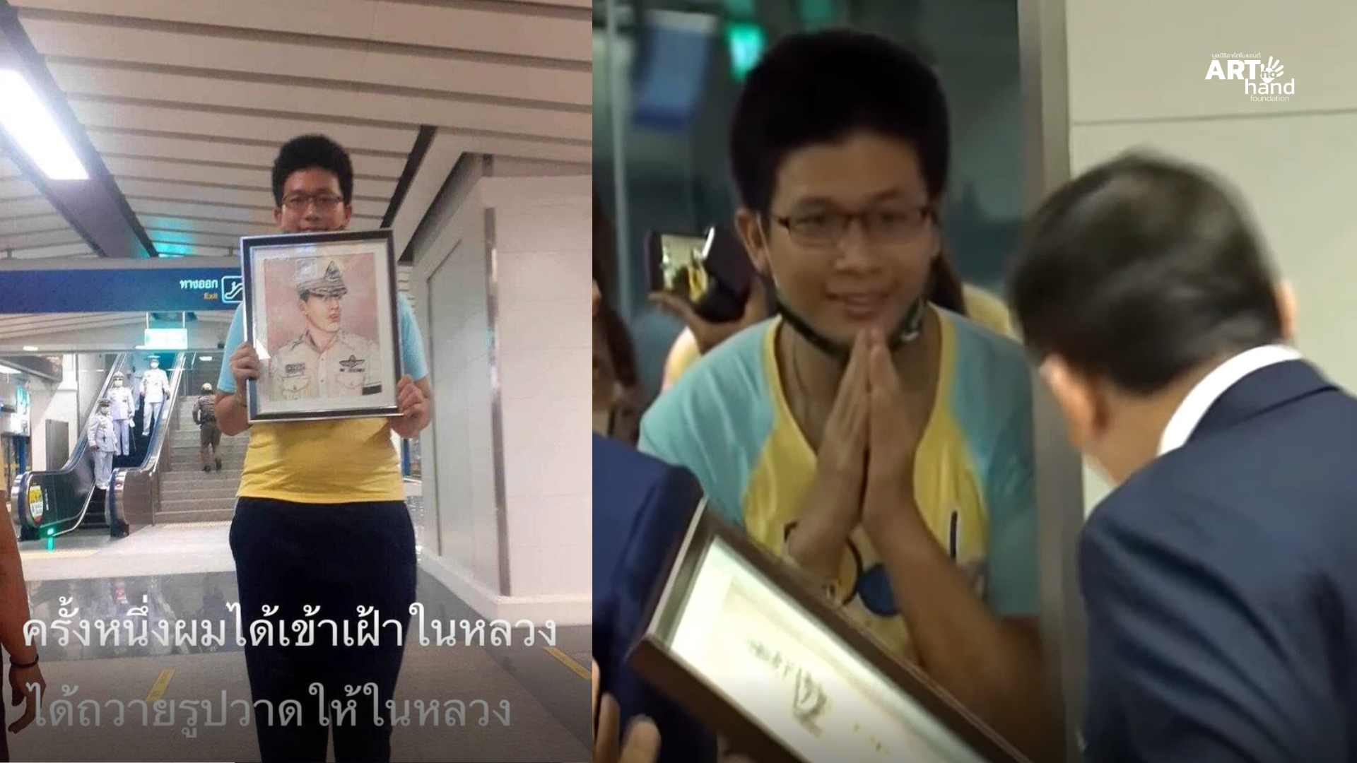 โอกาสที่ยิ่งใหญ่ที่สุดในชีวิต ผมได้รับโอกาสให้เข้าเฝ้าฯ ทูลเกล้าฯ ถวายภาพวาดฝีมือของตัวเองแด่พระบาทสมเด็จพระเจ้าอยู่หัวรัชกาลที่ 10 หัวใจของเด็กหนุ่มเต้นรัว ความตื่นเต้นถาโถมเข้ามาจนทำอะไรไม่ถูก โชคดีที่ในวันนั้น มีคุณป้าและพี่ๆ ทหารคอยอยู่เคียงข้าง ให้กำลังใจ และแนะนำขั้นตอนต่างๆ