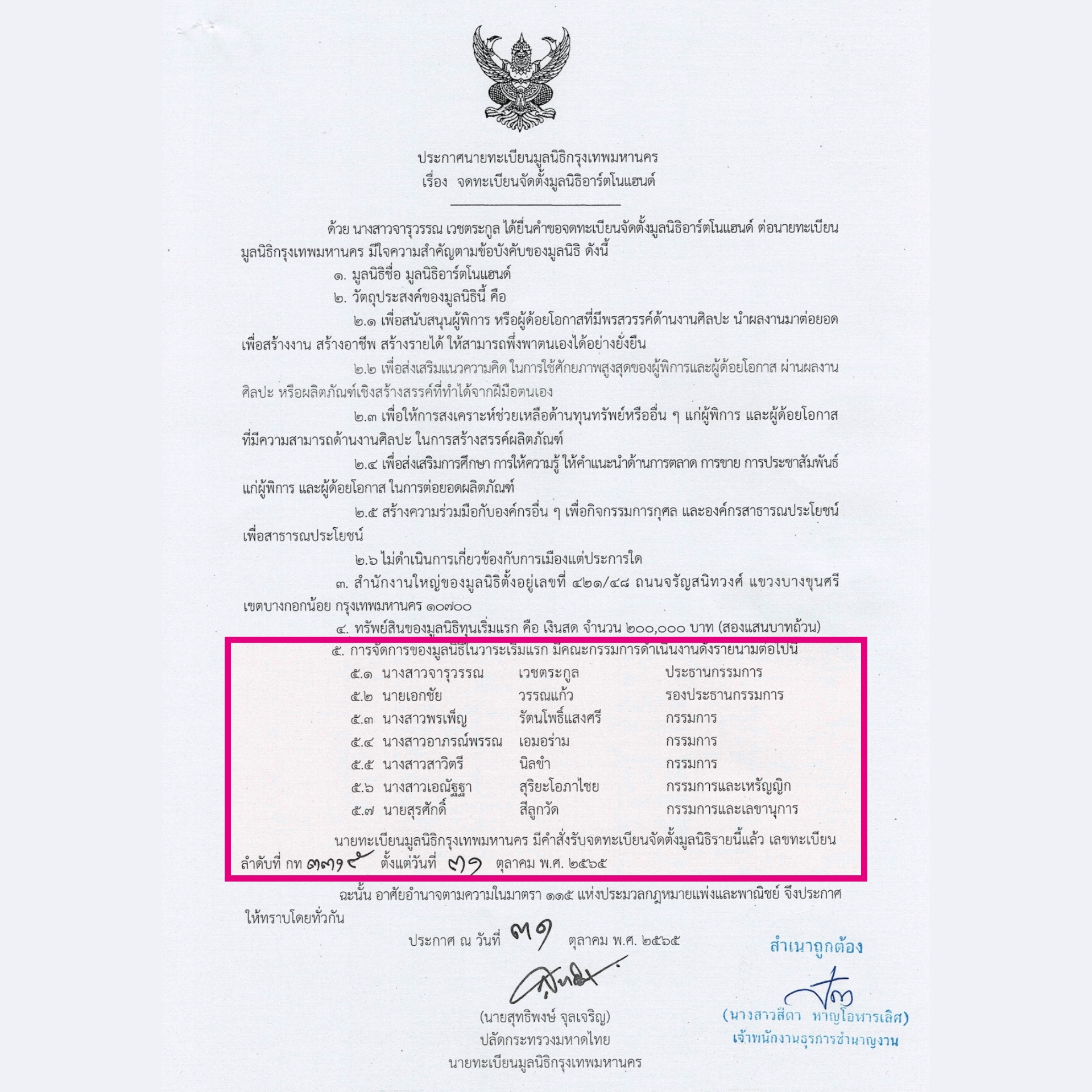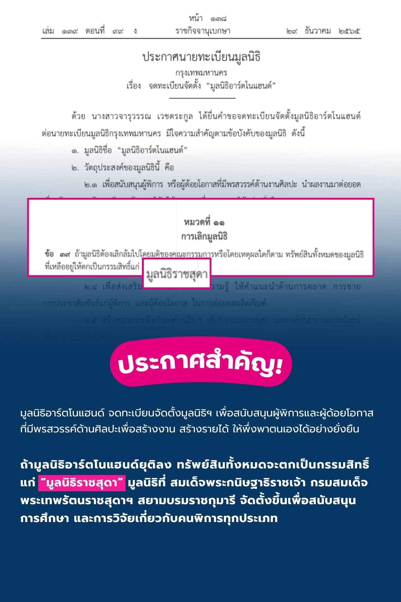 ทั้งนี้ เพื่อให้เจตนารมณ์ของมูลนิธิอาร์ตโนแฮนด์ ยังคงได้รับการสืบทอด และยังคง เป็นประโยชน์ต่อศิลปินพิการและสังคมไทยอย่างยั่งยืน