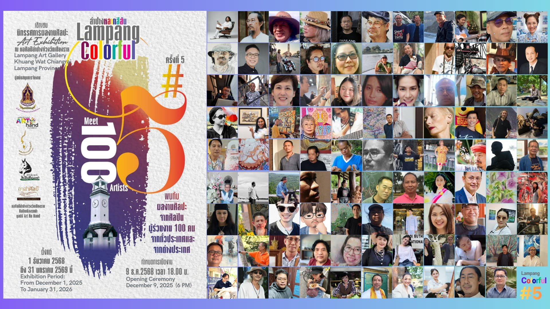 งานนิทรรศการศิลปะ Lampang Colorful #5 เริ่มจัดแสดงตั้งแต่วันที่ 1 ธันวาคม 2568 – 31 มกราคม 2569 ณ หอศิลป์ลำปาง ข่วงวัดเชียงราย ถนนบ้านเชียงราย อ.เมือง จ.ลำปาง (ใกล้แยกหอนาฬิกาลำปาง) ตั้งแต่เวลา 9.00 – 16.00 น. ผู้ที่สนใจสามารถเข้าชมงาน และให้กำลังศิลปินได้โดยไม่มีค่าใช้จ่าย