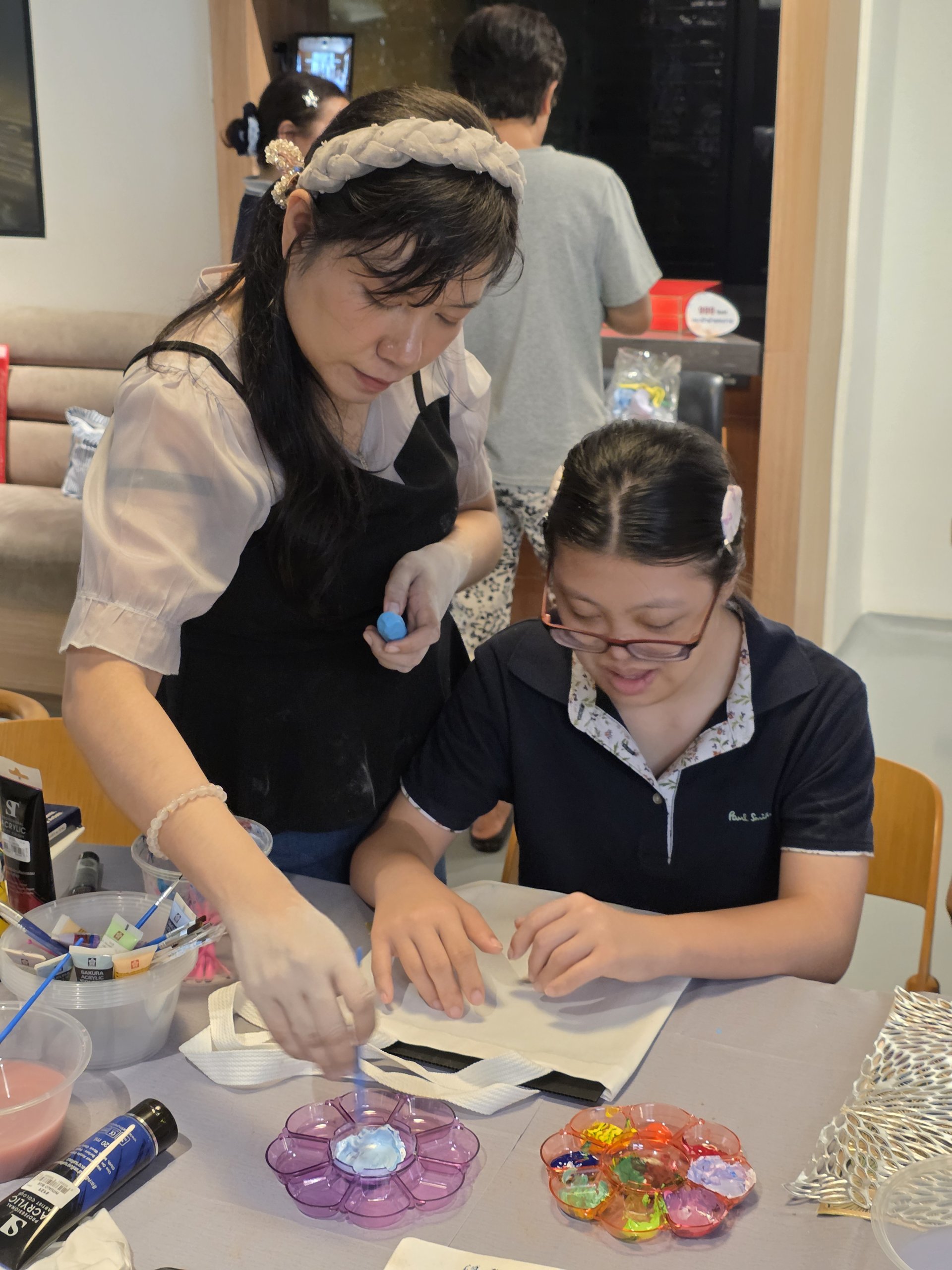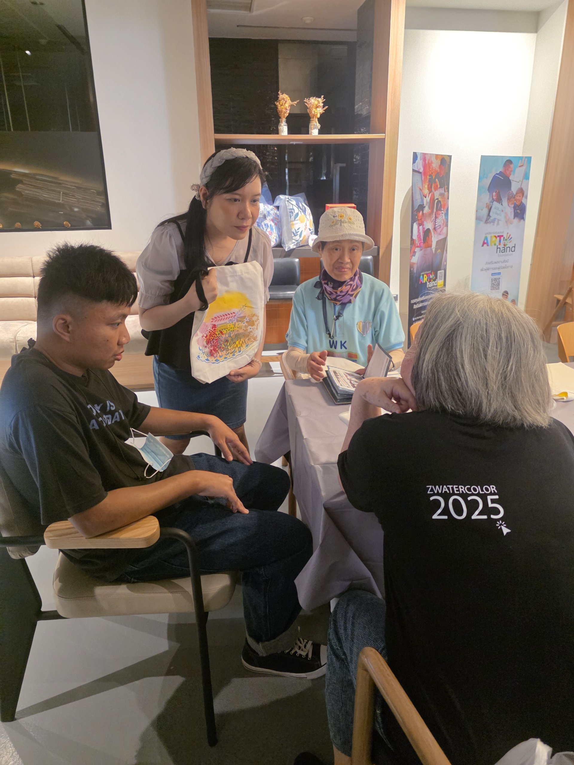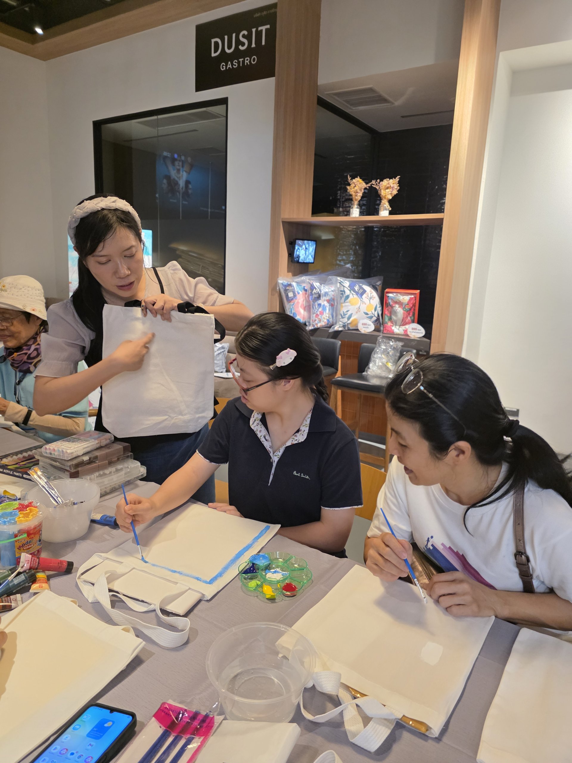 โดย ผศ.สุทธาสินีย์ สุวุฒิโฑ และน้องเพิร์ธ ศุภกร อัปมาโน ที่มาสอนการวาดภาพ การใช้สีอย่างสร้างสรรค์และการพิมพ์ภาพ ลงบนกระเป๋าผ้า ซึ่งเป็นผลงานของตนเองเพียงหนึ่งเดียวในโลก