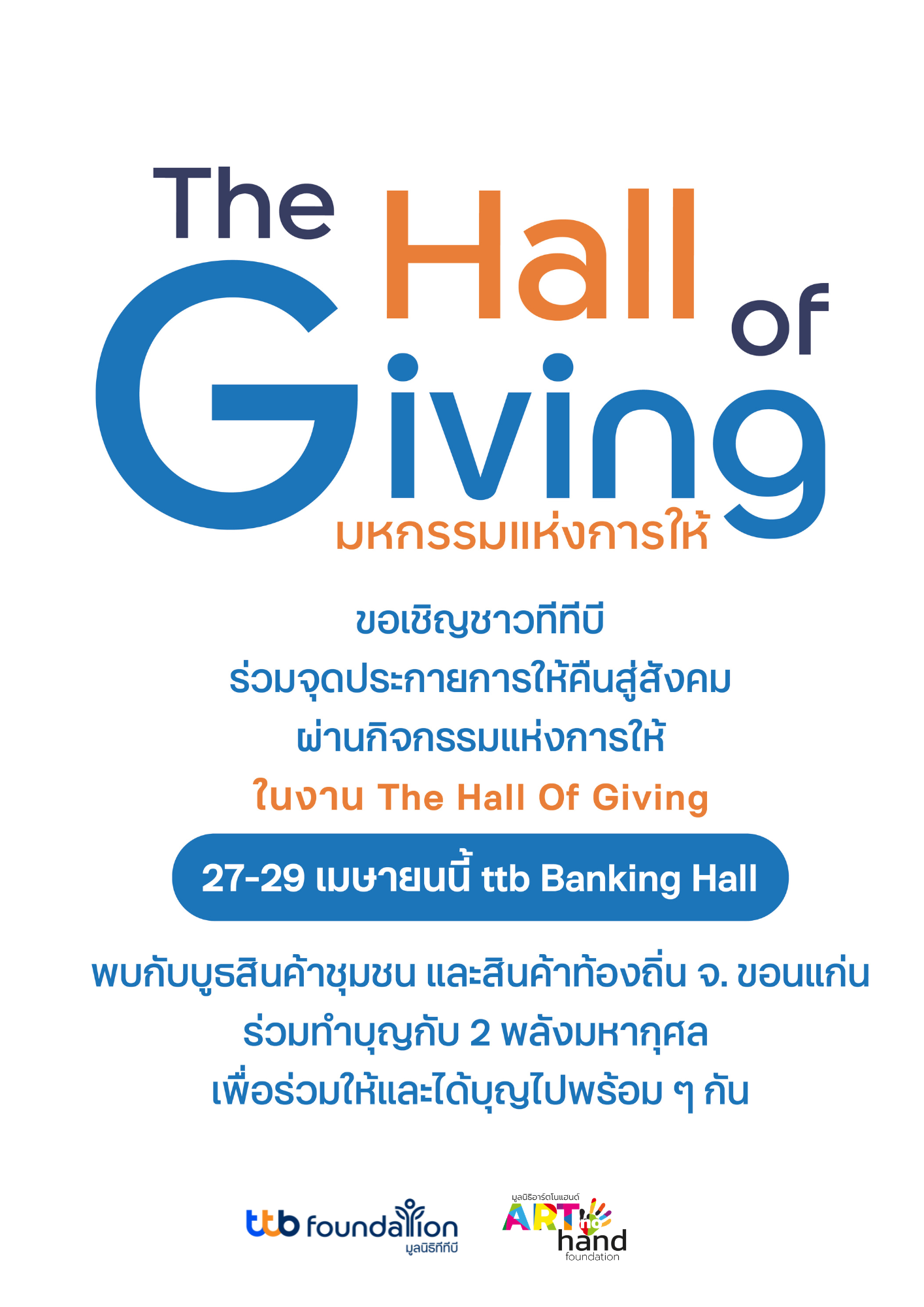 ขอเชิญร่วมสนับสนุนของที่ระลึก บูธมูลนิธิอาร์ตโนแฮนด์ ในการออกร้านโครงการ The Hall of Giving มหกรรมแห่งการให้ ระหว่างวันที่ 27 - 29 เมษายน 2569 ตั้งแต่เวลา 8.00 - 14.00 น. ณ อาคารทหารไทยธนชาติ จำกัด (สำนักงานใหญ่) TTB จตุจักร