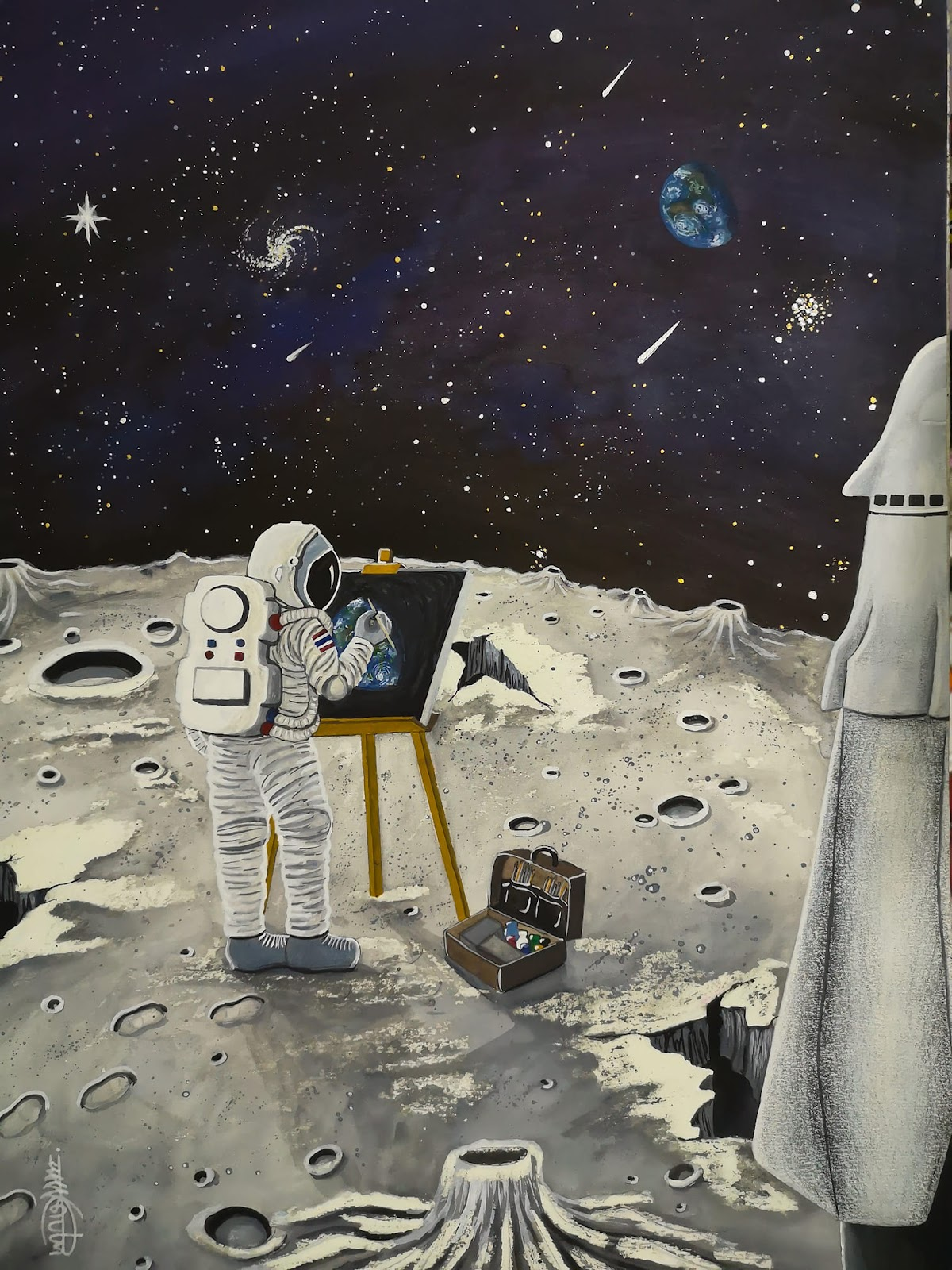 คนหนึ่งวาดดวงจันทร์อยู่บนโลก อีกคนหนึ่งดาวรูปโลกอยู่บนดวงจันทร์ ต่างดาว ต่างมุม เเต่มองเห็นกันเสมอ