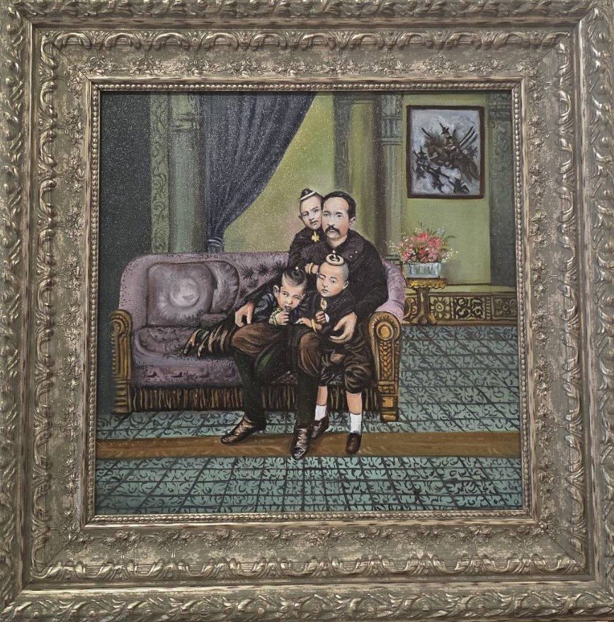 พระบาทสมเด็จพระจุลจอมเกล้าเจ้าอยู่หัว (รัชกาลที่ 5) ในบทบาทของ "พ่อ" ผู้เป็นที่รักของพระราชโอรส ท่ามกลางยุคสมัยแห่งการเปลี่ยนแปลงที่สยามเริ่มรับเอาอารยธรรมตะวันตกเข้ามาผสมผสาน ความสง่างามสไตล์ตะวันตกผ่านเครื่องทรงและการจัดวางท่าทางบนโซฟาบุหลุยส์ ไม่ลืมรากเหง้าของความเป็นไทยที่ปรากฏชัดบนลวดลายกระเบื้องปูพื้นอันละเอียดอ่อน ไม่ว่าบริบทของบ้านเมืองจะเปลี่ยนแปลงไปเพียงใด แต่ความผูกพันภายในครอบครัวยังคงเป็นรากฐานที่แข็งแกร่งที่สุดเสมอ