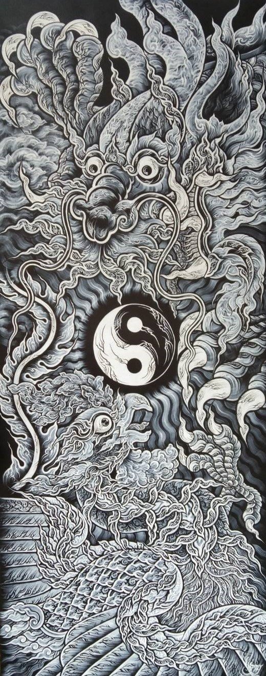 แห่งความสมดุล, ความเที่ยงธรรมที่เป็นไปอย่างถูกต้องใน หลักของอำนาจแห่งธรรมชาติ ความเป็นจริงที่คู่ขนานกันตลอดไป ผมโชคดีหน่อยที่มีโอกาสได้ศึกษาการวาดแบบ ศิลปะทางจีนมาพอควร เลยเอาโครงสร้างมาดัดแปลงใส่ลายไทยๆ ลงไปก็ได้อย่างที่เห็น